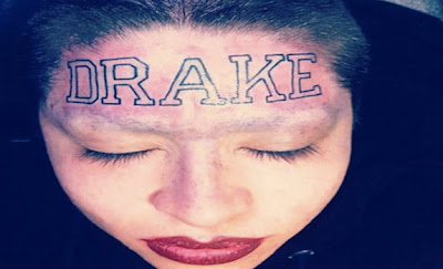 Drake on fan's forehead tat. No one could rightfully say that Drake’s fans won’t go to great lengths to prove their devotion. Last week, a photo of a young Los Angeles woman with shaved eyebrows and the all-caps word “DRAKE” tattooed on her forehead, caused many to wonder about the motivation behind the garish tat. Drake, now aware of the furor surrounding the tattoo, has addressed the artist, Kevin Campbell, and even threatened to, um, rough him up.